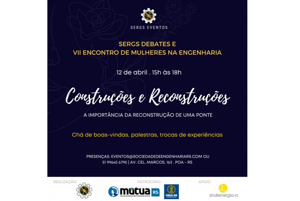 A Sociedade de Engenharia do Rio Grande do Sul (Sergs) promove, nesta sexta-feira (12/04), o “SERGS Debates”. O evento visa tratar sobre a Importância da Reconstrução de Uma Ponte, além de marcar o VII Encontro de Mulheres na Engenharia.