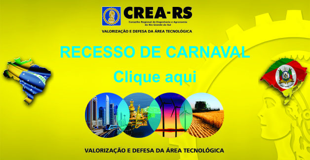 Não haverá expediente no CREA-RS nos dias 16 e 17 de fevereiro. O atendimento voltará na quarta-feira, das 12h às 18h.