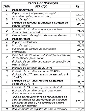 O reajuste para 2016 seguiu a variação do Índice Nacional de Preços ao Consumidor (INPC) da Fundação Instituto Brasileiro de Geografia e Estatística (IBGE), de 9,88%, relativa ao período de setembro de 2014 a agosto de 2015, período aprovado conforme os critérios estabelecidos pela Decisão Plenária 2040/2015, que obedece o Índice definido pela Lei nº 12.514/2011. A aplicação para o próximo exercício foi definida por meio das Decisões Plenárias 2041/2015 (valores de anuidades, serviços e multas) e 2042/2015 (ART), em deliberações da Comissão de Controle e Sustentabilidade do Sistema (CCSS).