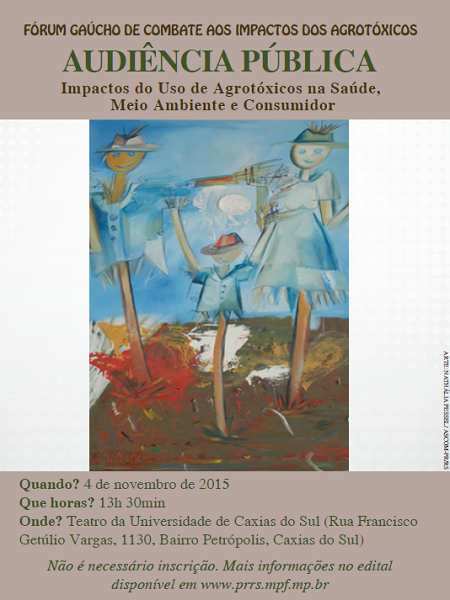 O Fórum Gaúcho de Combate aos Impactos dos Agrotóxicos convoca Audiência Pública a realizar-se no dia 4 de novembro, a partir das 13 horas, no Teatro da Universidade de Caxias do Sul (Rua Francisco Getúlio Vargas, 1130, Bairro Petrópolis, Caxias do Sul/RS).