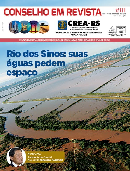 Na última edição de 2015 da publicação do CREA-RS, a matéria de capa fala sobre a votação histórica que ocorreu no Comitesinos em novembro. Como 26 votos a favor e 4 contra, foi aprovado o Mapeamento das Áreas Inundáveis na Bacia do Rio dos Sinos. É um mapa que define até onde vai a água e que pode orientar os planos diretores e os licenciamentos das prefeituras e do Estado, possibilitando maior transparência à sociedade e aos órgãos públicos sobre os locais que recebem investimentos para moradias e várias atividades humanas. A deliberação atende a uma das principais metas do Plano de Bacia do Rio dos Sinos, em vigor desde o ano passado. Na reportagem, a Conselho em Revista ouviu vários setores, como os representantes da Caixa Econômica Federal, que firmou um acordo de Cooperação Técnica com o Comitesinos, com o objetivo de inibir a construção habitacional nas planícies de inundação da Bacia, visando à proteção ao meio ambiente e à dignidade da pessoa.