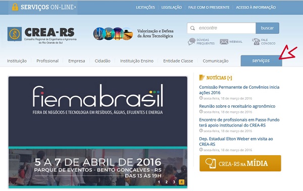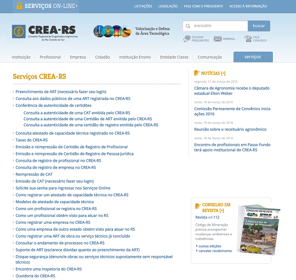 Buscando agilizar e facilitar a procura dos profissionais da área tecnológica, assim como a comunidade em geral, que buscam sanar suas dúvidas no site o Conselho Regional de Engenharia e Agronomia, foram reunidos em um só lugar os serviços mais procurados. Entre os que estão reunidos neste novo local podem ser encontrados: consulta de profissional, suporte de ART, taxas do CREA-RS, impressão do CAT, Consulta de Registro de Empresa, Ouvidoria entre outros.