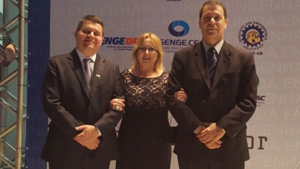 Eng. Civ. Alice entre os presidentes Alexandre Wollmann, Senge-RS, e Melvis (à dir.), CREA-RS. Créditos: Arquivo FNE