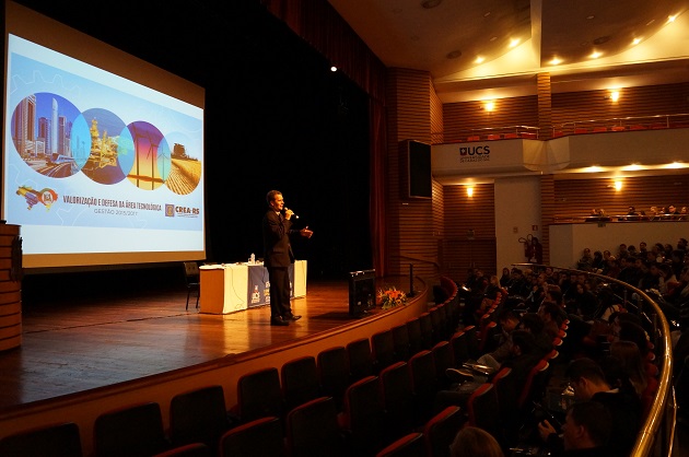 Organizado pelo núcleo gaúcho da Associação Brasileira de Mecânica dos Solos e Engenharia Geotécnica (ABMS), o Seminário de Engenharia Geotécnica do RS, que ocorreu nos dias 27 e 28 de abril, na UCS de Caxias do Sul, contou com a participação do presidente do CREA-RS, Eng. Civ. Melvis Barrios Junior, convidado para a palestra de abertura do evento. Cerca de 600 estudantes e profissionais da área participaram do debate, que também contou com a presença do inspetor-chefe de Caxias do Sul, Eng. Civ. Mário Cesar Michielon Rech, e do inspetor-secretário, Eng. Agr. Mauro Cirne.