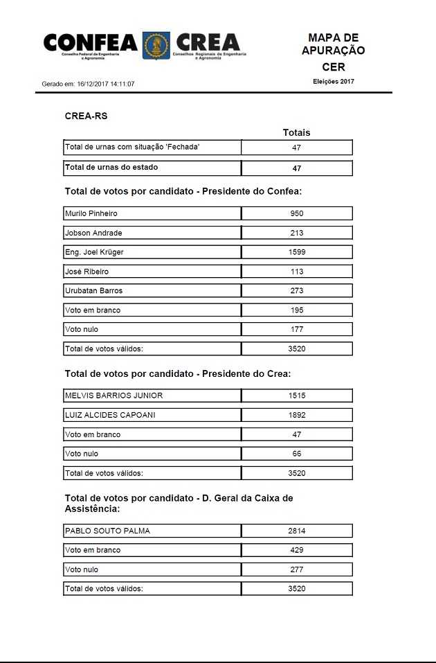 A Comissão Eleitoral regional – CER RS reunida no dia 16/12/2017, após análise do Processo Eleitoral, relata abaixo as informações relevantes em relação às eleições do Sistema Confea/Crea e Mútua – 2017, ocorridas em 15/12/2017.