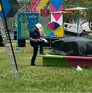 Foram verificadas todas as instalações do parque como: estruturas metálicas, palco, iluminação, sonorização, locação e instalação e destinação final dos resíduos de banheiros químicos, laudos técnicos, elaboração e execução de Plano de Prevenção e Proteção Contra Incêndio (PPCI) e manutenção de equipamentos.