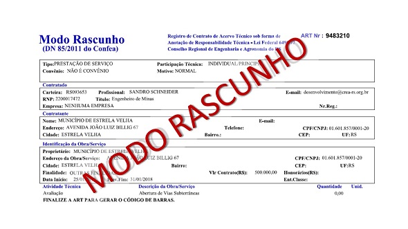 Prevista na Decisão Normativa do Confea nº 85, de 31 de janeiro de 2011, a Anotação de Responsabilidade Técnica (ART) no modo rascunho serve para o contratante da obra/serviço aprovar as informações da ART, nos termos do contrato “cliente x empresa de Engenharia ou profissional autônomo”. A ART impressa contém uma marca d’água escrito “Modo Rascunho”.
