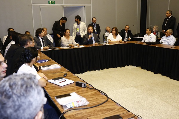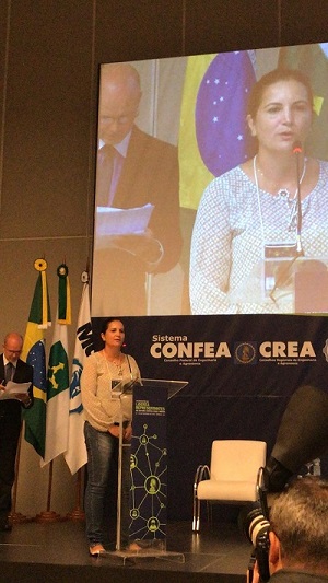 Engenheira Andrea Brondani da Rocha, à direita do presidente do Confea, durante reunião de Colégio de Entidades em Brasília. Créditos: Arquivo Confea