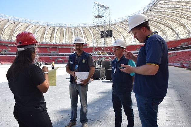 Uma equipe de agentes fiscais do Conselho esteve, na manhã desta segunda-feira (26), no estádio Beira-Rio, em Porto Alegre, que recebe hoje (27) o show de Phil Collins e no domingo (04/03) da banda Foo Fighters. A estrutura de palco será a mesma para os dois shows. Porém, na quarta-feira, para abrigar o jogo do Internacional e Cianorte, pelo Copa do Brasil, serão retiradas as torres de luz e da proteção do gramado. O palco permanecerá no local, apenas recebendo uma proteção.