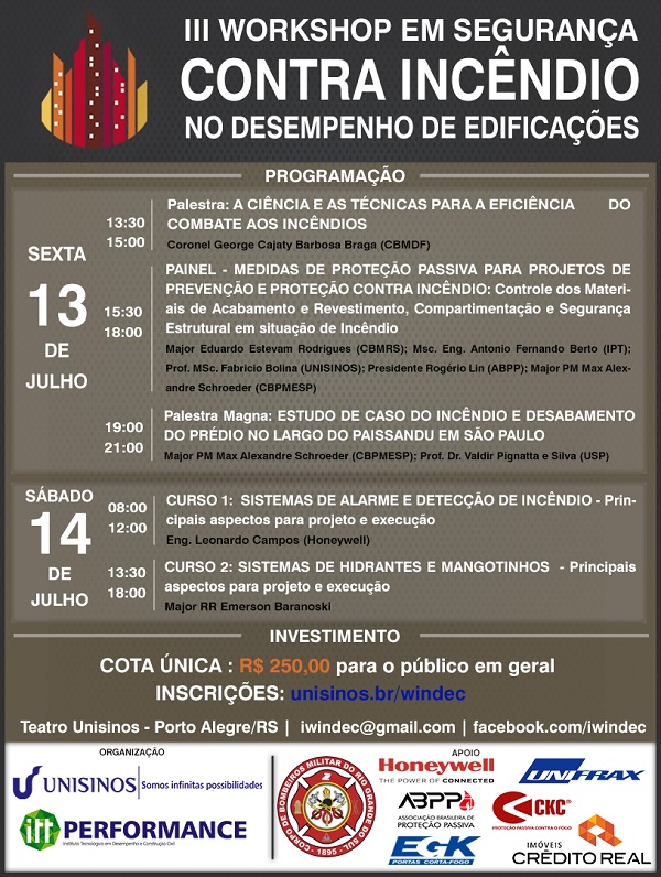 Nos dias 13 e 14 de julho, acontece a terceira edição do Windec - Workshop em Segurança Contra Incêndios no Desempenho das Edificações. A atividade objetiva promover o aprimoramento técnico dos profissionais que trabalham ou pretendem trabalhar na área. Este ano, o campus Unisinos Porto Alegre sediará o evento.
