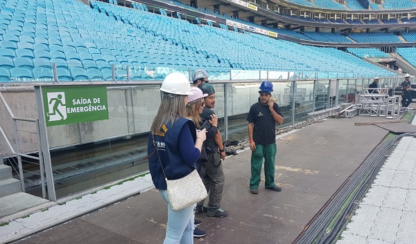 Na manhã desta segunda-feira (22), a agente fiscal Fernada Delavi, do CREA-RS, esteve na Arena do Grêmio para verificar a responsabilidade técnica dos serviços executados para a montagem de estruturas para o show da cantora colombiana Shakira. O objetivo é garantir que os trabalhos sejam realizados por profissionais e empresas com habilitação, conforme documentação apresentada na fiscalização.