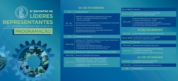 De 20 a 22 de fevereiro, ocorre em Brasília o 8º Encontro de Líderes Representantes do Sistema. Realizado anualmente pelo Confea, o encontro reúne profissionais ligados ao Sistema Confea/Crea para definir os coordenadores e o plano de trabalho para o ano das coordenadorias de Câmaras, do Colégio de Entidades Nacionais e Colégio de Presidentes.