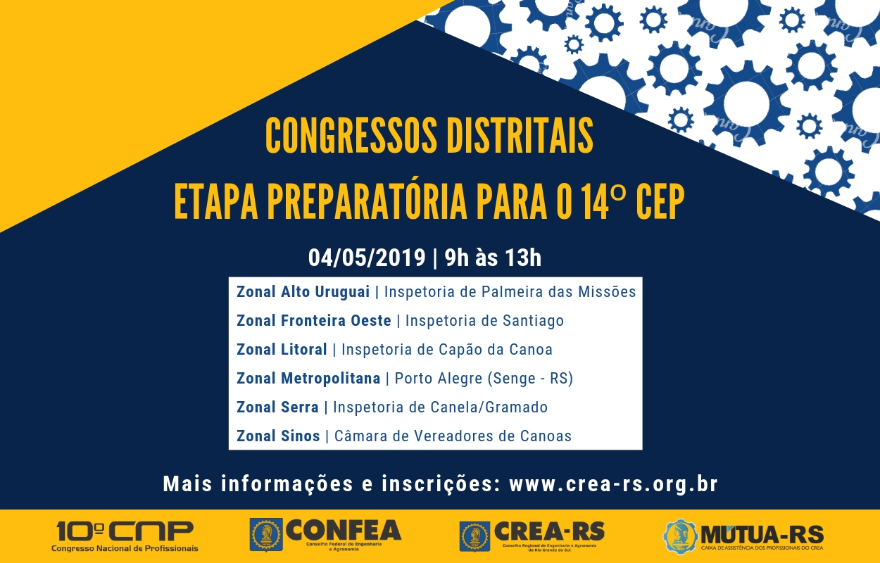 Etapas preparatórias para o Congresso Nacional dos Profissionais, os Congressos Distritais é uma grande oportunidade para que os registrados no Sistema Confea/Crea debatam melhorias para a regulamentação de suas profissões, refletindo na valorização de seu trabalho. São espaços para apresentar propostas, discutir e definir estratégias, planos e programas de atuação em suas áreas.