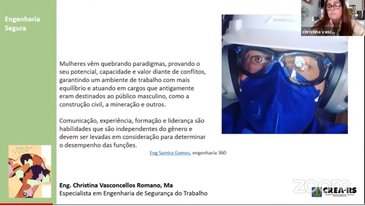 Na última live da série “Mulheres que Fazem a Diferença, o tema foi “Engenharia Segura”, com a Especialista em Eng. Seg. Trab. Christina Romano. Formada em Engenharia Civil pela UFSM, com Especialização em Engenharia de Segurança do Trabalho na universidade, e mestrado em Sistemas de Produção e Ergonomia pela Ufrgs, a profissional tem 29 anos de atuação nesta área em empresas e indústrias e também na docência, como professora em cursos de pós-graduação.