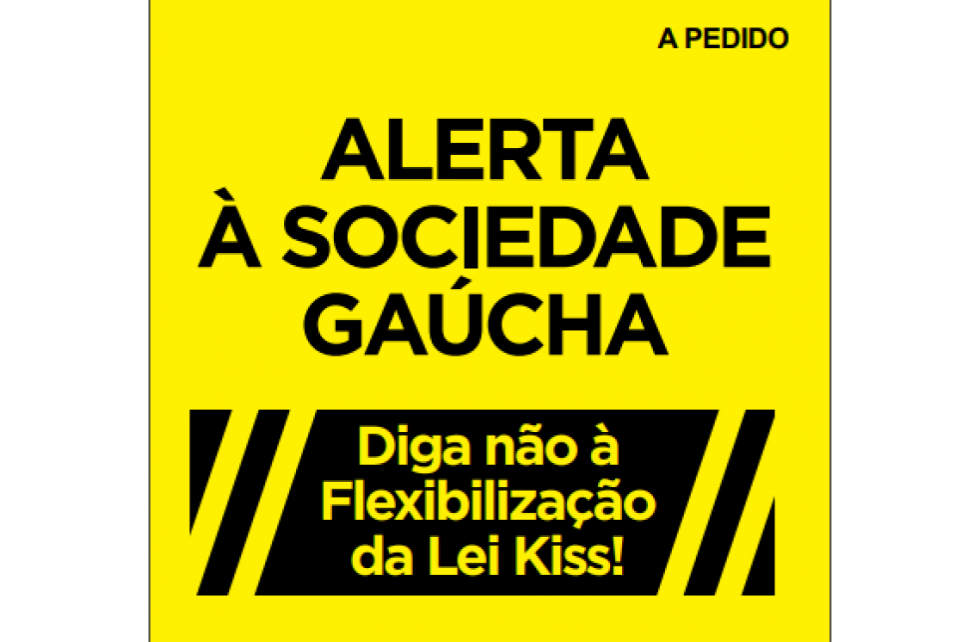 Dessa forma, consideramos gravíssima a flexibilização da Lei Kiss, razão pela qual se pede apoio a toda a sociedade gaúcha para que, no dia 27/06/2022 às 14 horas, compareça à Audiência Pública no Plenarinho da Assembleia Legislativa do Rio Grande do Sul para que o projeto seja retirado de pauta e arquivado, ou ainda reprovado. Não vamos deixar retroceder a Lei Kiss. A segurança é prioridade da sociedade!