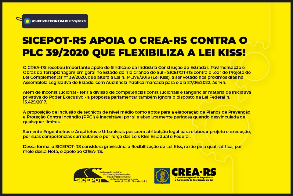 Dessa forma, o SICEPOT-RS considera gravíssima a flexibilização da Lei Kiss, razão pela qual ratifica, por meio desta Nota, o apoio ao CREA-RS.