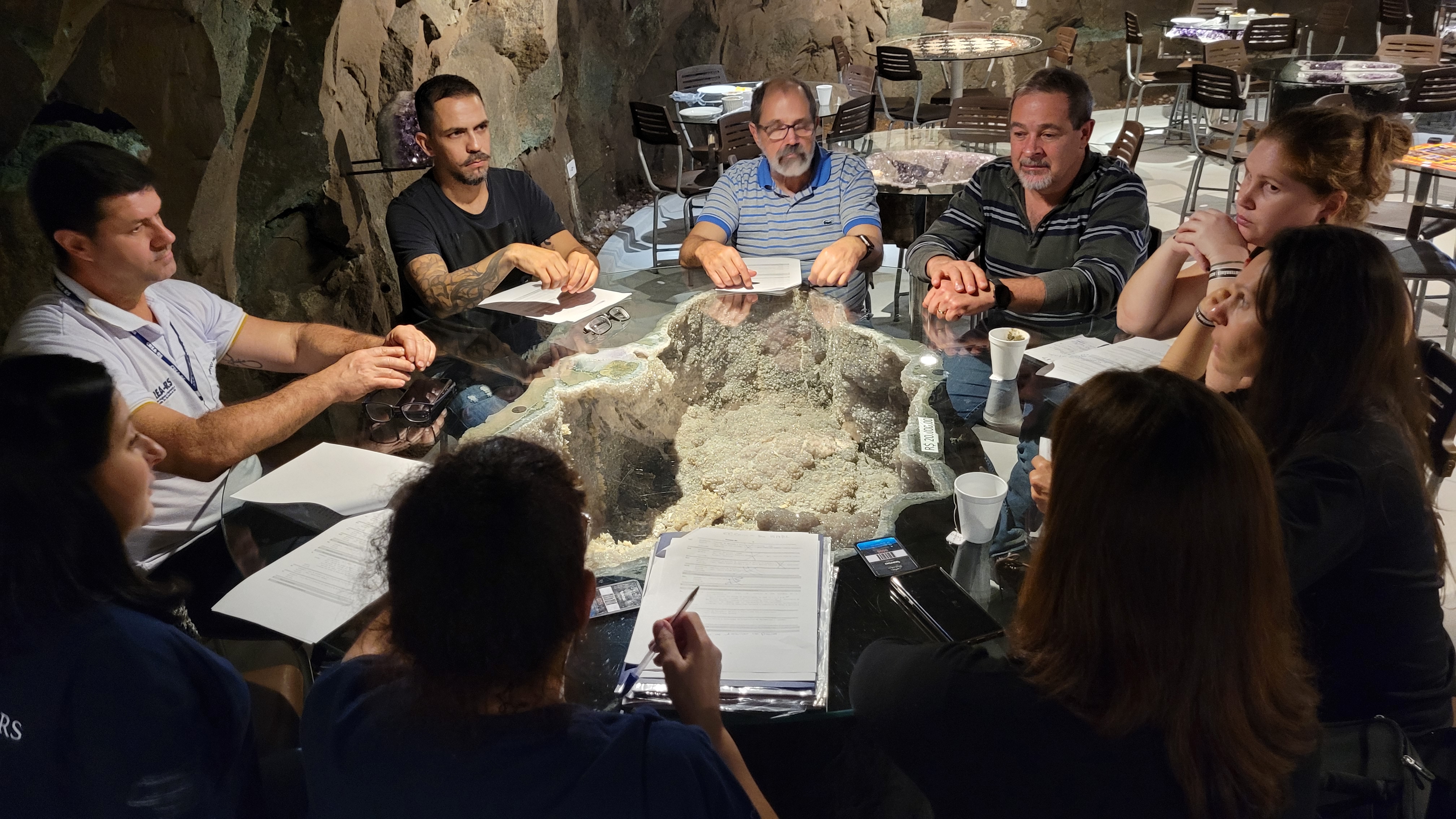 Após visita técnica em minas de Ametista do Sul, conselheiros da Câmara de Geologia e Engenharia de Minas (GeoMinas) realizaram sua reunião estendida dentro de uma galeria subterrânea. Foi a primeira vez que isto ocorreu, apesar das experiências de reuniões em Nova Prata e São Marcos, em Pedreiras. Na pauta, a responsabilidade técnica em projetos e beneficiamento de minerais das minas de Ametista.