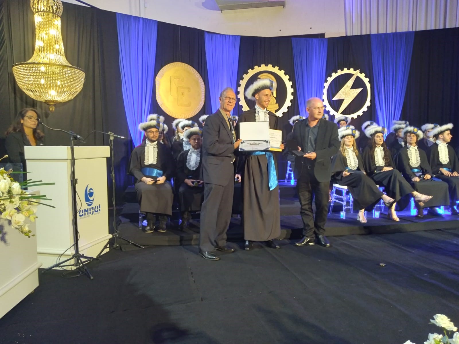 Da Universidade Regional do Noroeste do Rio Grande do Sul (Unijuí Campus Santa Rosa), a Engenheira Civil Yasmim Sincak e o Engenheiro Eletricista Leonardo Rafael Willers receberam sua homenagem do Engenheiro Civil e Ind. Mecânico Alberto Stochero, conselheiro da Câmara Especializada de Engenharia Civil.