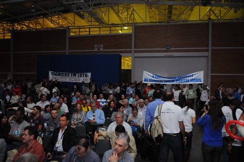Com três faixas – “Técnicos de luto, direitos iguais”, “A constituição garante e os técnicos exigem direitos iguais” e “Democracia proporciona direitos iguais a todos”, os técnicos demonstraram para a plateia de cerca de 3 mil presentes o seu repúdio à decisão de afastá-los do Sistema, retirando sua voz e poder de voto.